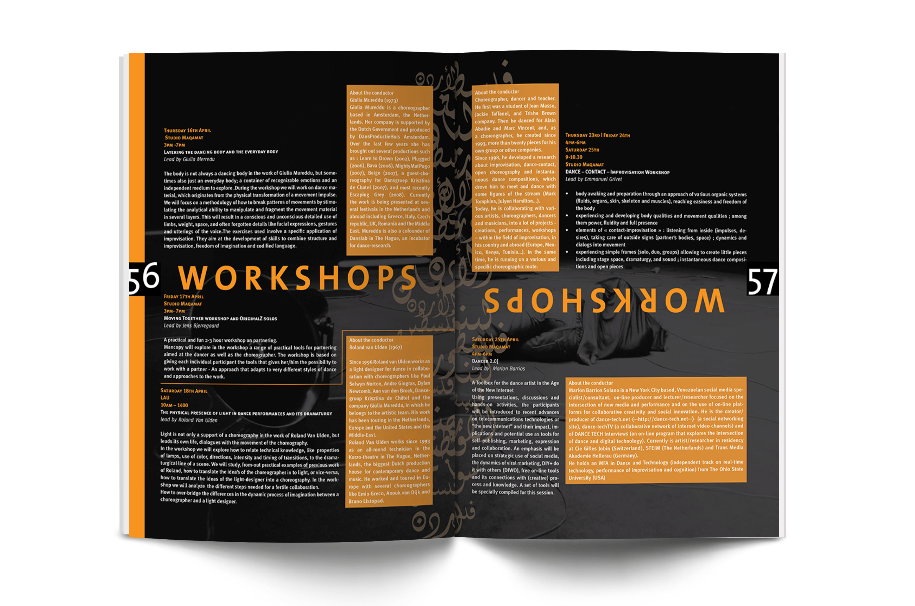 The festival's print material (magazine, tickets, invitations, flyers, ads) were all bilingual (English & arabic), and were done on four versions for each of the participating countries of the Masahat Network (Lebanon, Palestine, Syria, Jordan).